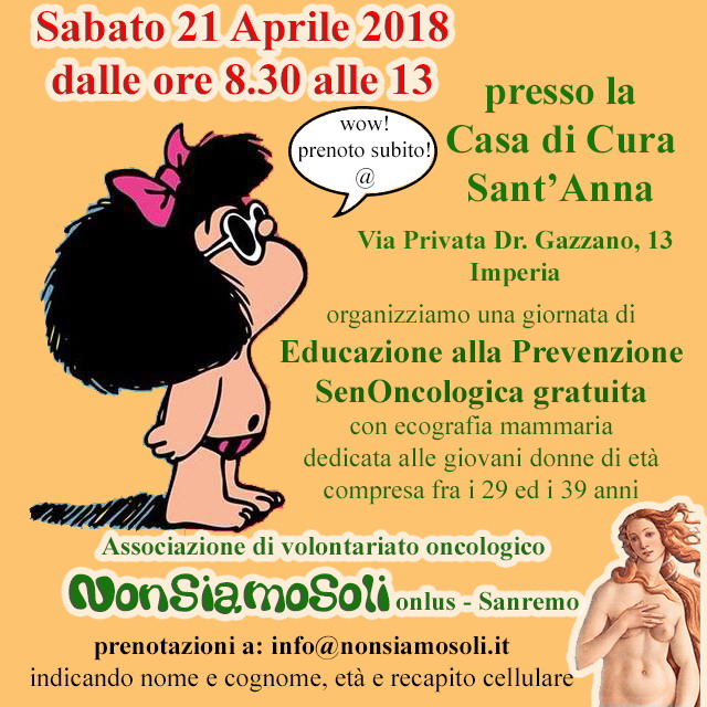Nell'ambito della terza ‘Giornata Nazionale della Salute della Donna’ l'associazione di volontariato oncologico ‘NonSiamoSoli onlus’ di Sanremo organizza, per sabato prossimo (dalle 8.30 alle 13 alla Casa di Cura Sant'Anna in via Gazzano ad Imperia), una giornata gratuita di Educazione alla Prevenzione Senoncologica dedicata alle giovani donne di età compresa fra i 29 ed i 39 anni.