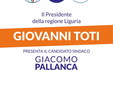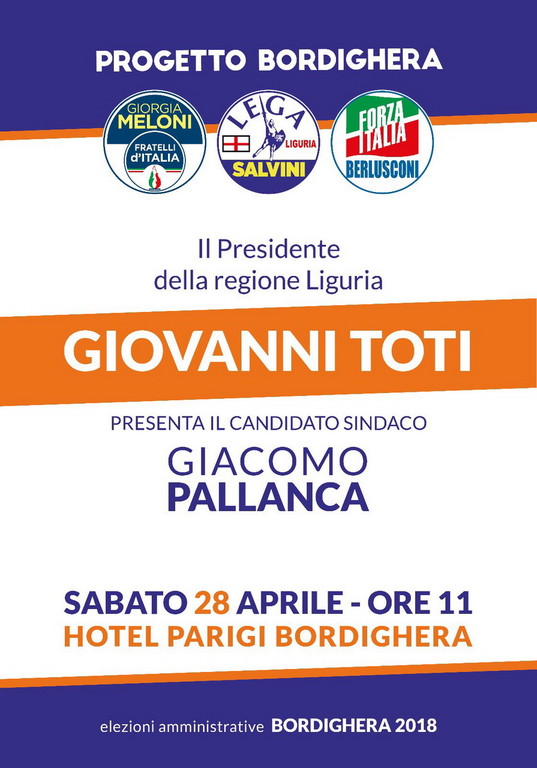 Domani sabato 28 aprile alle ore 11.00 all’hotel Parigi di Bordighera il Presidente Giovanni Toti presenterà la candidatura a Sindaco di Giacomo Pallanca sostenuto dall’associazione cittadina 'Progetto Bordighera' e dei partiti del centro destra.