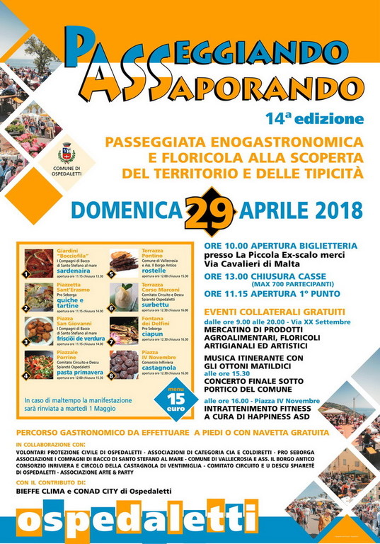 "Anche per questa quattordicesima edizione verranno proposte - spiega gli organizzatori -, lungo un percorso cittadino e collinare di circa km 4, degustazioni di piatti della cucina locale in collaborazione con i Comuni, le pro loco e le associazioni dell’estremo ponente ligure, il tutto ‘condito’ da iniziative collaterali.