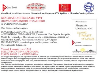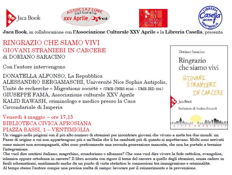 Venerdì 4 maggio, alle 17.15 presso la Biblioteca Aprosiana di Ventimiglia (sede di Piazza Bassi 1), in occasione della presentazione del volume “Ringrazio che siamo vivi – Giovani stranieri in carcere” di Doriano Saracino, importante confronto con il tema degli immigrati attualmente detenuti nelle prigioni italiane. Con l’autore, ne discutono Donatella Alfonso (giornalista di Repubblica), Alessandro Bergamaschi (docente dell’università di Nizza), Giuseppe Famà (associazione culturale XXV aprile) e Kalid Rawash (medico presso la casa circondariale di Imperia).