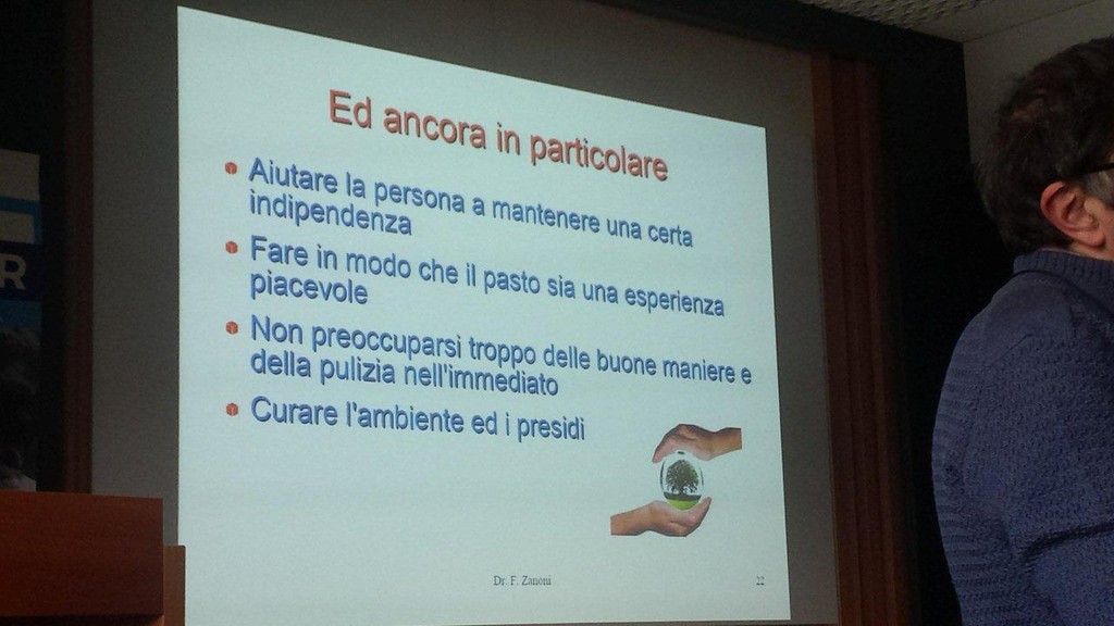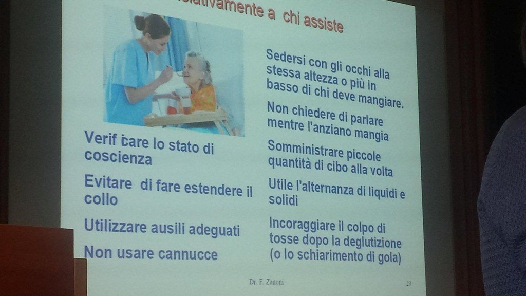 Ad aprire i lavori il dottor Franco Zanoni, specialista in geriatria e gerontologia, responsabile della Struttura Semplice di Ortogeriatria presso l’Ospedale di Sanremo, che ha parlato in modo efficace ed esaustivo del ruolo dell’alimentazione nelle persone malate di Alzheimer, illustrando tutte le misure , gli accorgimenti e le principali indicazioni da rivolgere , in particolar modo, a chi soffre di disfagia (il termine medico che descrive ogni difficoltà o fastidio legati al processo di deglutizione), disturbo cui va incontro un’alta percentuale di persone affette da demenza. Il dottor Zanoni ha proposto una visione inusuale della demenza, mettendo in luce il concetto della ‘dimensione della persona e del rispetto dell’individuo’, che non va trattato come un malato ormai incapace di decidere, comprendere, agire o emozionarsi, piuttosto come un adulto, seppur in fase regressiva, che assume atteggiamenti tipici dei bambini, la cui cura richiede molta pazienza e il coinvolgimento di tante figure sanitarie, dal logopedista al fisioterapista. L’intervento è stato seguito con molto interesse dal pubblico in sala, tra cui molti operatori socio-assistenziali, alcuni dei quali provenienti dalla provincia di Savona.