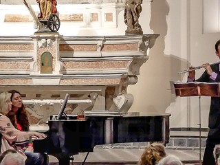 Primo appuntamento con un concerto dal repertorio variegato, che spazia dal Seicento al secolo scorso. Protagonisti Gianni Gollo (flauto) e Paola Arecco (pianoforte). Musiche di W.A.Mozart, C.Gounod, F.Poulenc, J.S.Bach, A.Piazzolla, J.Massenet, G.Donizetti, P.Mascagni, G.Faurè, G.Caccini, E.Morricone e M.Frisina.