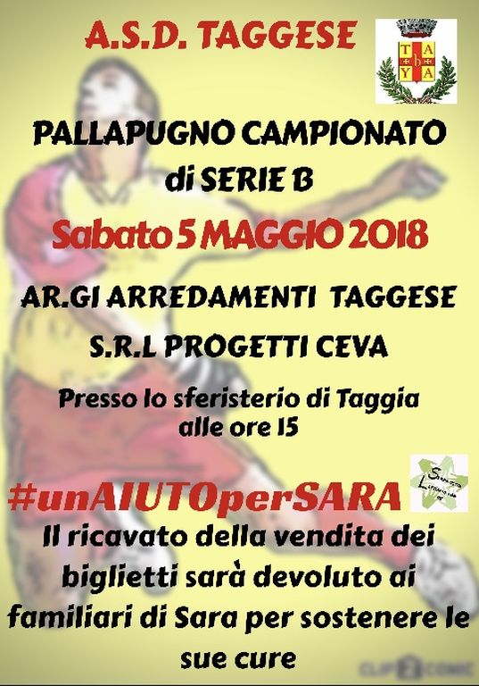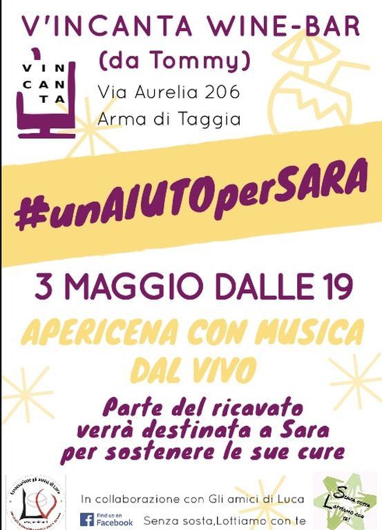Sono anche stati organizzati due eventi che si terranno rispettivamente domani e sabato prossimo. Domani, al wine-bar ‘V’incanta da Tommy’ di Tommaso Costagliola, in via Aurelia 206 ad Arma di Taggia, si terrà un apericena solidale dove parte del ricavato verrà donato alle cure per Sara. Sabato, invece, appuntamento allo sferisterio di Taggia per una partita di pallapugno di serie B che vedrà fronteggiarsi la Ar.Gi. Arredamenti Taggese contro Progetti Ceva. L’ingresso è fissato ad offerta minima di 5 euro e l’intero ricavato verrà interamente devoluto, dal Presidente Marco Cagnacci, a Sara.