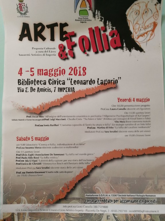 È stato presentato questa mattina il convegno ‘Arte e Follia’, l’ultima proposta culturale a cura del Liceo Amoretti-Artistico, in programma i giorni 4 e 5 maggio presso la Biblioteca Civica ‘Lagorio’ di Piazza De Amicis. con il patrocinio del Comune di Imperia.
