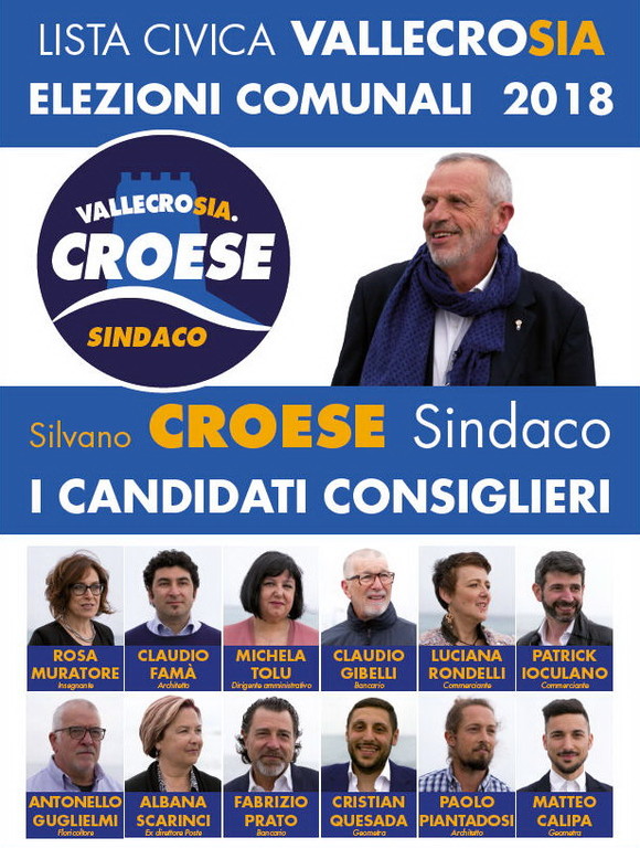 Questi i candidati (sotto il file scaricabile con i dettagli): Rosa Muratore (la Maestra Rosella), insegnante della scuola Primaria di Vallecrosia. Claudio Famà, 42 anni architetto, esercita la sua attività professionale da oltre dieci anni. Michela Tolu, nata a Sanremo 48 anni or sono, sposata e mamma di Niccolò ed Elìa. Laureata in Economia e Commercio all'Università di Genova con indirizzo aziendale è dirigente amministrativo di una società. Claudio Gibelli, bancario in pensione iscritto al PD Circolo di Vallecrosia. Esperienza Sindacale trentennale e consigliere comunale uscente dell'attuale Amministrazone Giordano, passato all'opposizione a novembre 2017. Luciana Rondelli, vive e lavoro a Vallecrosia dove gestisce la Vineria ‘Jadò’. Figlia di Commercianti, ex Assessore al Turismo Manifestazioni e Attività Produttive, nella Giunta Croese anni 2005-10. Antonello Guglielmi (Edo): 60 anni floricoltore di Vallecrosia e per la prima volta si candida in una lista elettorale. Albana Scarinci, ex direttrice di ufficio postale. Ha lavorato per circa 20 anni come impiegata nell'ufficio postale di Vallecrosia. Fabrizio Prato, 52 anni impiegato da circa 15 presso un noto Istituto bancario, dove svolge la mansione di Consulente finanziario. Paolo Piantadosi, laureato in Architettura al politecnico di Torino con 10 anni di esperienza all'estero nella decorazione d'interni e di spazi verdi. Matteo Calipa, 29 anni, Geometra, si occupa prevalentemente di pratiche catastali e certificati energetici, progettazione e direzione lavori. Patrick Ioculano, nato a Ventimiglia da una famiglia che ha dedicato la vita al commercio, da 5 anni è proprietario del noto negozio “Anna Sport”in Vallecrosia.