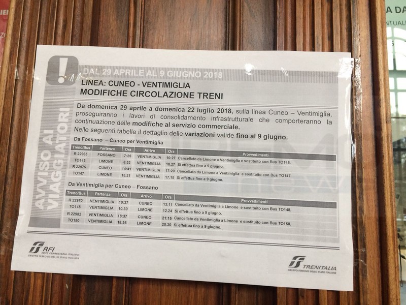 Sui vetri della biglietteria della stazione di Cuneo campeggia un cartello che avvisa che, fino al 22 luglio, saranno attive le modifiche alla circolazione per i lavori di consolidamento della tratta ferroviaria Cuneo-Ventimiglia.