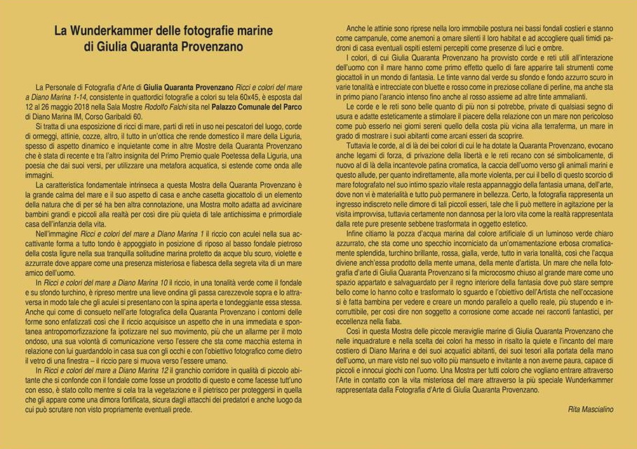 Si tratta di una esposizione di ricci di mare, parti di reti in uso nei pescatori del luogo, corde di ormeggi, attinie, cozze, altro, il tutto in un'ottica che rende domestico il mare della Liguria, spesso di aspetto dinamico e inquietante come in altre Mostre della Quaranta Provenzano che è stata di recente e tra l'altro insignita del Primo Premio quale Poetessa della Liguria, una poesia che dai suoi versi, per utilizzare una metafora acquatica, si estende come onda alle immagini.