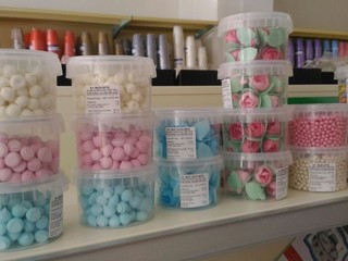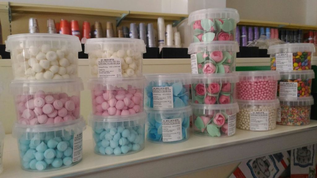 Michela ha cercato ovunque ed ha trovato quel che cercava ad Imperia nel negozio di Nicoletta e del fratello Fabrizio, Carta 2.0. Qui ha trovato tutto quello che le serviva: ha scelto la pasta di zucchero senza glutine e no OGM da 250 gr e le perline di zucchero, attaccabili con la colla alimentare fatta apposta, l'isomalto; per le prossime volte, però, si è tenuta bene a mente la possibilità di poter usare anche i fiori, i bottoni di cioccolato, i cuori di marshmallow rosa e azzurri e le meringhette bianche e/o rosa. Per la scritta ha quindi trovato dei comodi tubetti di zucchero e ha preso lo sciroppo di glucosio e alcuni generi di coloranti in oro ed argento in gel (preferito come necessità personale al colorante in spray e in polvere) per altre decorazioni.