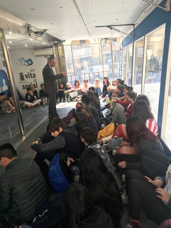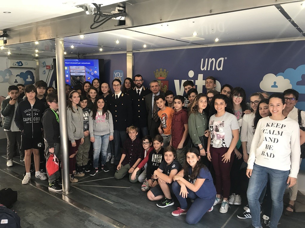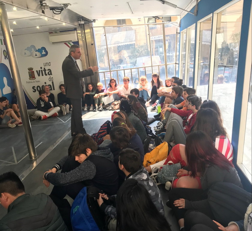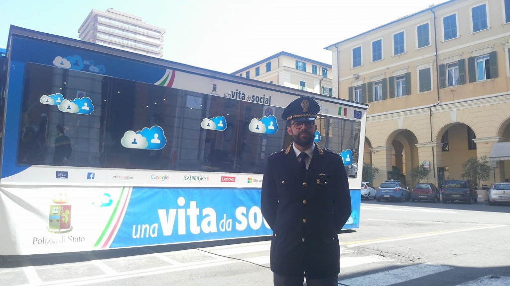 La Questura di Imperia sensibilizza i giovani sull'uso corretto della tecnologia, attraverso la campagna "Una vita da social", che ha visto protagonista il Questore Cesare Capocasa questa mattina in un incontro con i ragazzi delle scuole all'Auditorium della Camera di Commercio, dove è in corso il VideoFestival e in seguito a bordo del pullman in piazza Dante, dove la Polizia spiega quelli che sono i principali rischi sul web.