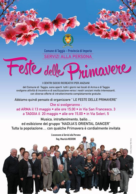Domenica 13 maggio, ad Arma di Taggia, dalle ore 15:00 si terrà il primo dei due appuntamenti con la ‘Festa delle primavere’. Si tratta di un’iniziativa curata dall’assessore ai servizi alla persona, Maurizio Negroni che spiega: “E’ un’importante iniziativa aperta a tutta la cittadinanza che magari ha qualche ‘primavera’. Con queste attività promuoviamo i nostri centri socio ricreativi per anziani che tanto fanno la comunità tabiese”.