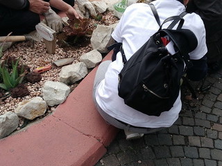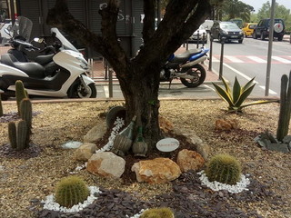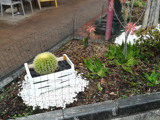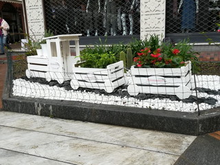 1) n. 3 AIUOLE di VIA HANBURY: posa di un ornamento davvero speciale ovvero un trenino di legno colorato con piante grasse e fiori, realizzato con cassette della frutta, ardesia nera quale binari, pietre bianche quali ornamento; aggiunta di pietre bianche, corteccia, sostituzione piante, eliminazione erbacce, sistemazione recinzione, concimazione;