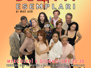 Andrà in scena mercoledì 6 giugno alle ore 20,30 “Delitti Esemplari” tratto da un romanzo di Max Aub scrittore poco conosciuto in Italia perché non tradotto, ma di notevole ironica scrittura. “Delitti Esemplari” ne è un raffinato esempio. Si tratta in sostanza di 82 confessioni di altrettanti ipotetici omicidi, di cui in scena ne ascolteremo il racconto solo di 13, “quelli che quotidianamente in intenzione si commettono e che Aub, facendo diventare realtà la mistificazione, dà per avvenuti”. Un'animata discussione ad un semaforo tra una guardia e una donna accusata ingiustamente a suo avviso di esser passata col rosso si conclude tragicamente; un barbiere ossessionato dai brufoli dei clienti a cui fa la barba adotta una soluzione radicale; un cliente di un bar che gira e rigira ossessivamente il cucchiaino nella tazza viene freddato dal revolver della persona seduta di fronte a lui.