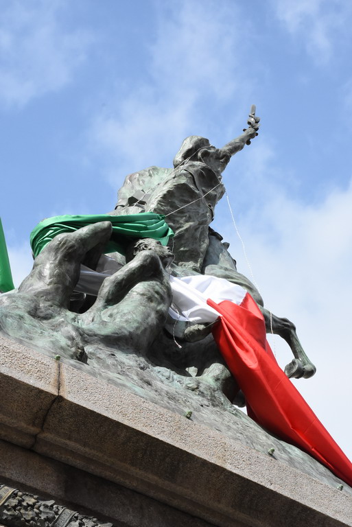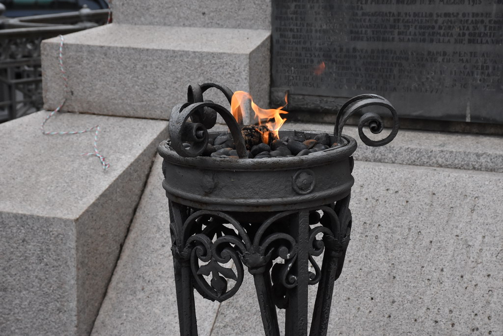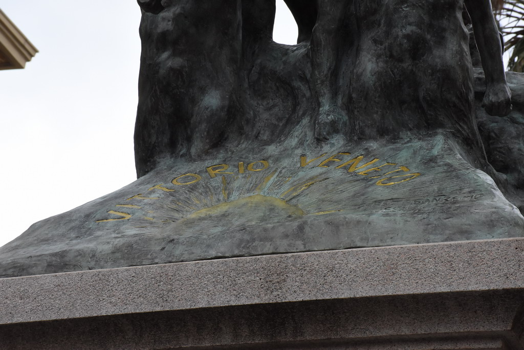 Vincenzo Pasquali aveva concepito il piedistallo in forma di un’ara le cui fiamme, simboleggianti la fede animatrice, alimentavano il sacrificio degli eroi, sospinti nel cielo dall’Ideale del loro ardimento supremo, coronato dalla Vittoria recante la spada intrecciata con l’ulivo.