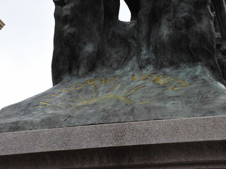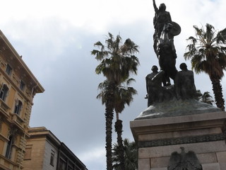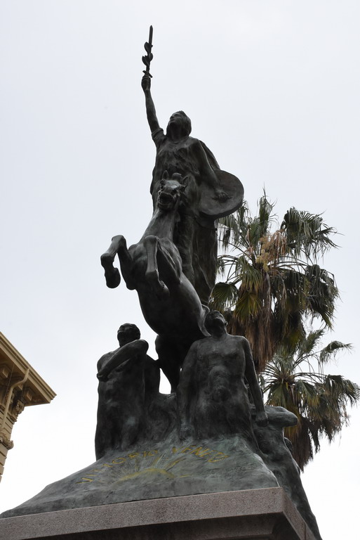 La statua rappresenta una donna a cavallo che brandisce una spada, con i condottieri ai propri piedi. L’incarico di realizzarla è stato affidato all’artista napoletano Domenico Sepe, autore di tante opere in bronzo presenti in tutta Italia e dedicate a figure storiche, martiri e, appunto, ai caduti. Durante il secondo conflitto mondiale la parte bronzea del monumento è stata rimossa e offerta ai centri di raccolta metalli per sostenere lo sforzo bellico. Il monumento era alto 9 metri circa.