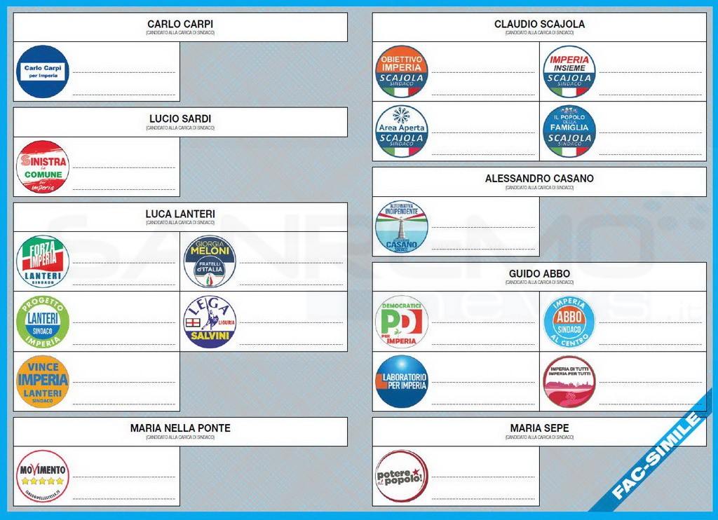 Quest’anno si presentano ben 8 candidati a Sindaco e, se 5 anni fa la vittoria fu praticamente scontata, quest’anno la ‘partita’ è decisamente più equilibrata. I Candidati sono: Luca Lanteri, sostenuto dalle liste del centro destra (Forza Imperia, Vince Imperia, Fratelli d’Italia, Progetto Imperia e Lega); Claudio Scajola, con sole liste civiche (Imperia insieme, Obiettivo Imperia, Area Aperta ed il Popolo della Famiglia); Guido Abbo, sostenuto dalle liste del centro sinistra (Partito Democratico, Imperia al centro, Imperia di Tutti e Laboratorio per Imperia); Alessandro Casano (Alternativa indipendente); Maria Nella Ponte (M5S), Lucio Sardi (Sinistra in Comune), Maria Sepe (Potere al Popolo) e Carlo Carpi (Insieme per Imperia).