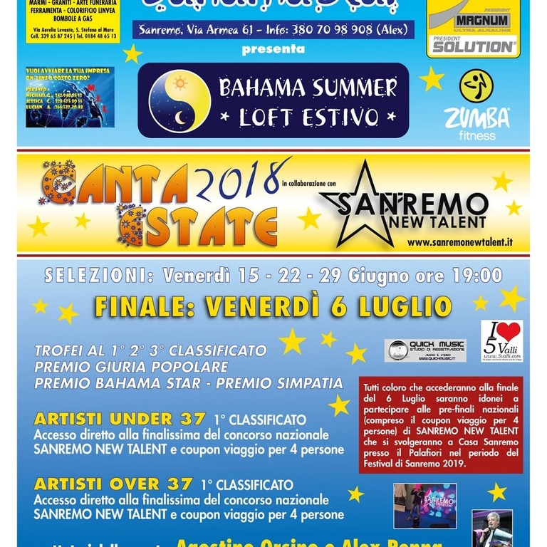 Al Bahama Star fervono i preparativi per venerdì 15 giugno, serata in cui ci sarà la prima prova selettiva per gli aspiranti cantanti. Il Cantaestate 2018 è un concorso canoro che mette in palio una borsa di studio e la partecipazione alle finali nazionali di Sanremo New Talent Winter, presso "Casa Sanremo" nel periodo del Festival. Alex Penna, organizzatore dell'evento e vocal coach ricorda a tutti gli aspiranti cantanti di: “affilare le ugole in vista dell'inizio ufficiale della manifestazione”. Per iscriversi al concorso c'è ancora tempo, leggi prima il Regolamento e poi compila il Modulo di Iscrizione! Non aver paura, fai uscire l'artista che c'è in te! Lo staff del Bahama Star ti aspetta per un fine settimana all'insegna della competizione, del divertimento e del buon cibo.