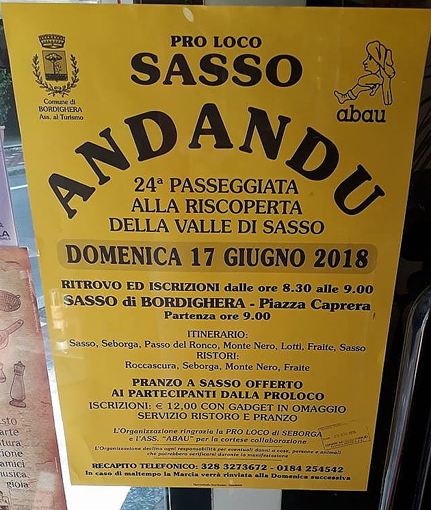 Nuovo record positivo per numero di partecipanti questa mattina alla 24a passeggiata alla riscoperta della valle di Sasso: Andandu, organizzata dalla Pro Loco Sasso in collaborazione con Pro Loco Seborga e l'associazione Abau.
