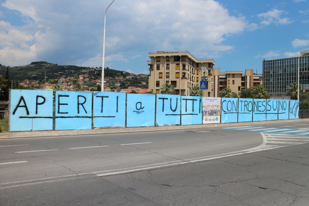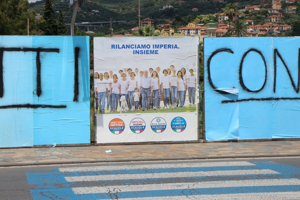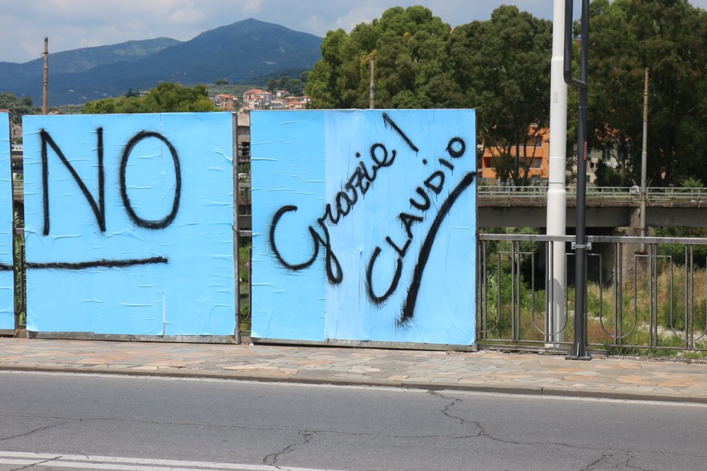 E' arrivata notte tempo, a conclusione della serata di festeggiamenti nel point onegliese di Claudio Scajola, l'enorme scritta realizzata sugli impianti elettorali del ponte Impero.
