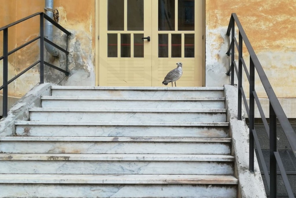 Un piccolo di gabbiano è caduto questa mattina da un probabile nido sul tetto della scuola di via Volta a Sanremo.