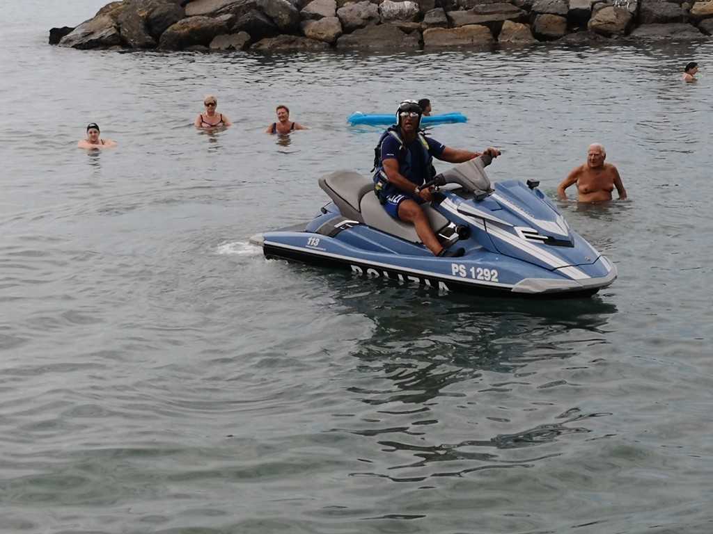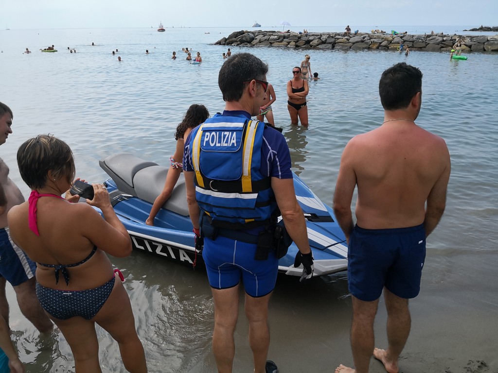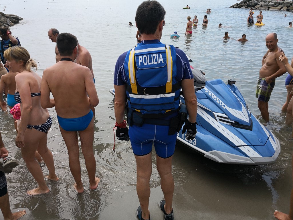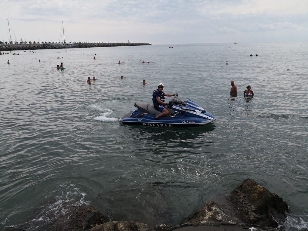 "Siamo qui ai bagni Oneglio per presentare ancora una volta quello che facciamo tutti i giorni sulle strade, quindi in prossimità e vicinanza alla gente. Come lo facciamo con le volanti in ambito cittadino, anche in mare abbiamo quelle che possiamo definire le nostre ‘volanti’. Sono in tutto e per tutto degli acqua scooter normali, però dotati delle attrezzature della Polizia di Stato, in particolare la radio, quindi sono connessi alla nostra centrale operativa e anche a quella della Capitaneria di Porto, perché non dimentichiamo che essendo in ambito acquatico, abbiamo comunque una collaborazione con competenza specifica della Capitaneria di Porto e una specifica della Polizia di Stato, quindi i controlli di Polizia che facciamo con le volanti li facciamo anche in ambito marino. Sono macchine molto potenti, arrivano a toccare i cento chilometri, più di sessanta nodi. Sono dotati di un particolare sistema che anche ravvicinandosi alla riva non hanno nessun pericolo per i bagnanti, in quanto l’elica è racchiusa in una pompa a idrogetto, e sono molto duttili per poter arrivare in zone della costa nascoste, per i soccorsi in mare.