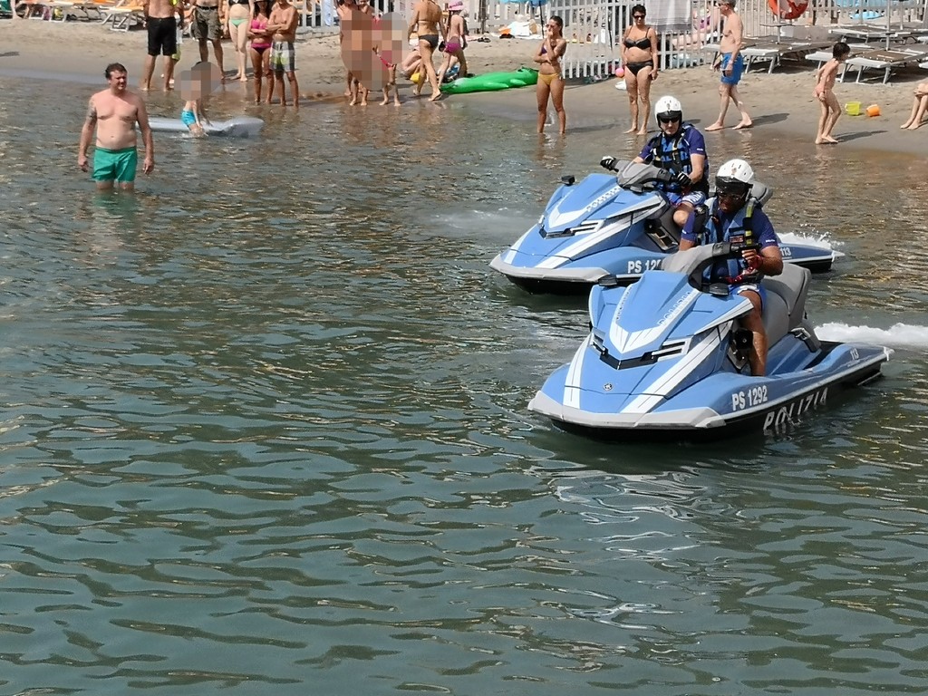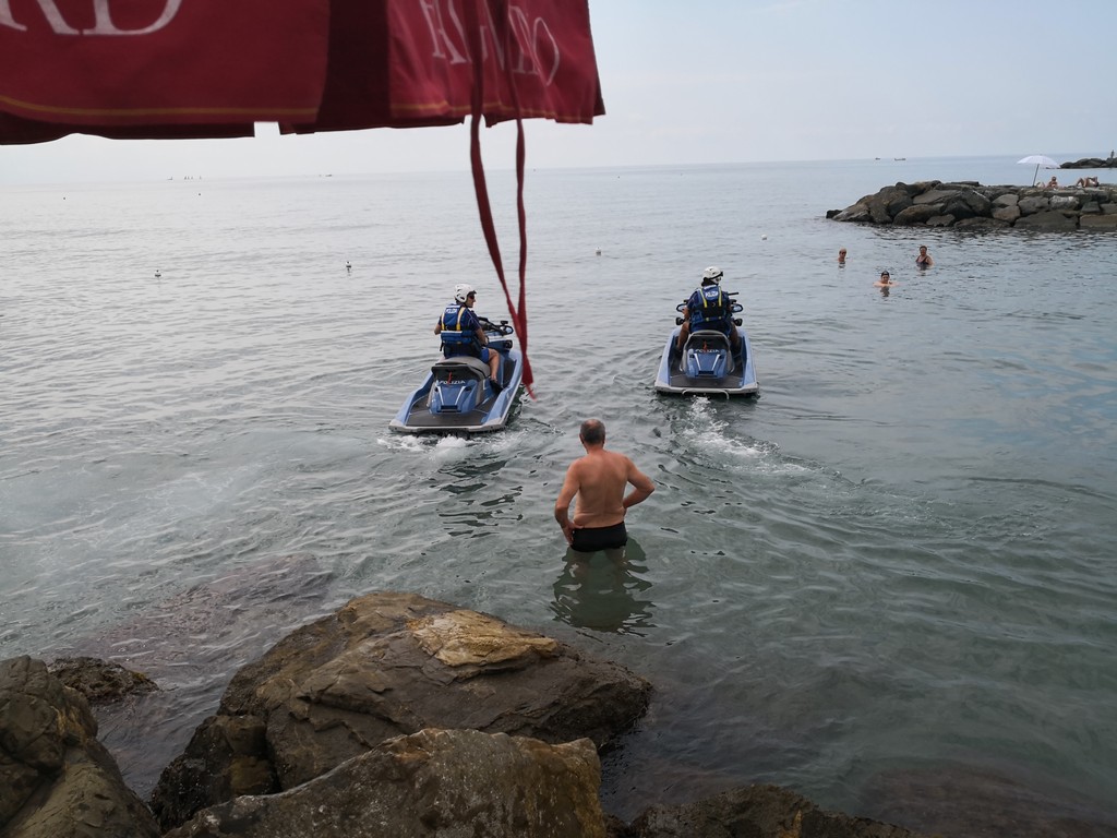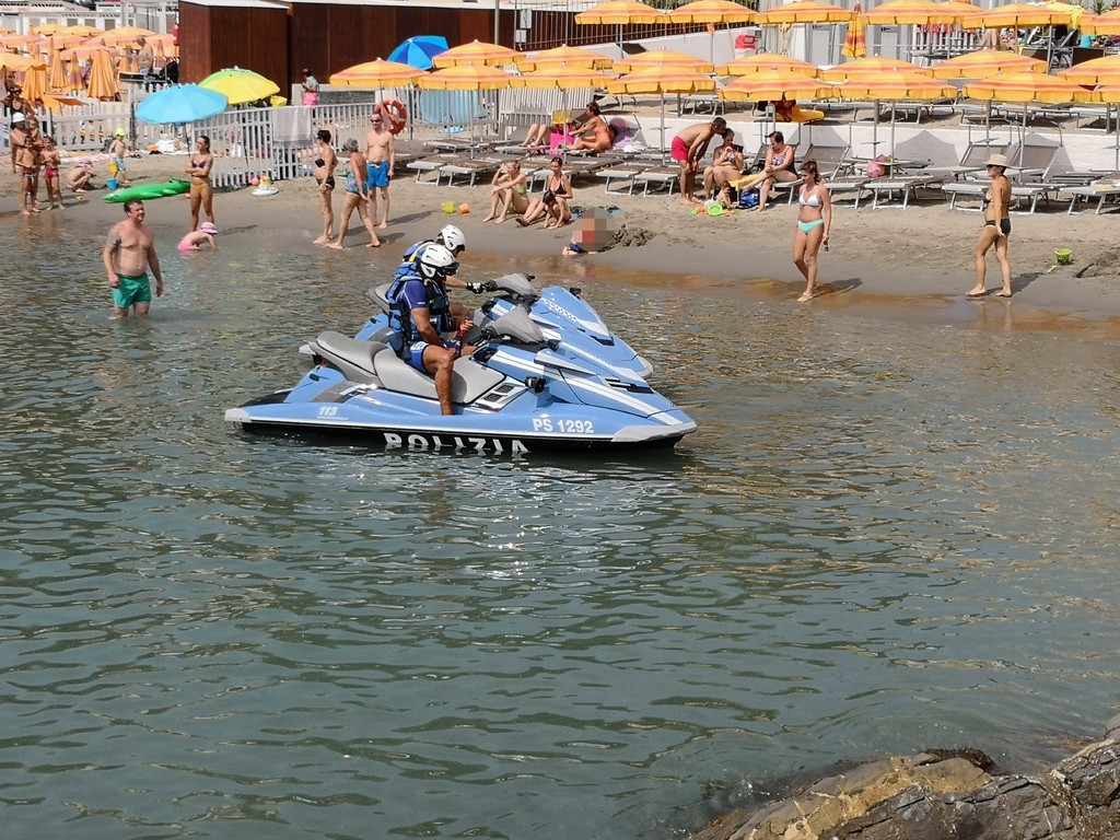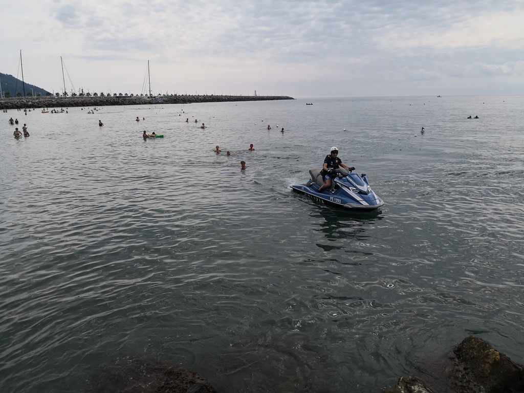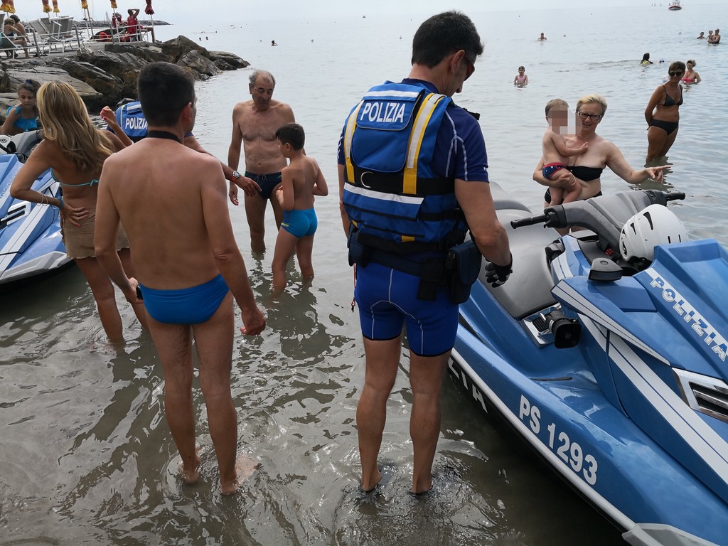 "Siamo qui ai bagni Oneglio per presentare ancora una volta quello che facciamo tutti i giorni sulle strade, quindi in prossimità e vicinanza alla gente. Come lo facciamo con le volanti in ambito cittadino, anche in mare abbiamo quelle che possiamo definire le nostre ‘volanti’. Sono in tutto e per tutto degli acqua scooter normali, però dotati delle attrezzature della Polizia di Stato, in particolare la radio, quindi sono connessi alla nostra centrale operativa e anche a quella della Capitaneria di Porto, perché non dimentichiamo che essendo in ambito acquatico, abbiamo comunque una collaborazione con competenza specifica della Capitaneria di Porto e una specifica della Polizia di Stato, quindi i controlli di Polizia che facciamo con le volanti li facciamo anche in ambito marino. Sono macchine molto potenti, arrivano a toccare i cento chilometri, più di sessanta nodi. Sono dotati di un particolare sistema che anche ravvicinandosi alla riva non hanno nessun pericolo per i bagnanti, in quanto l’elica è racchiusa in una pompa a idrogetto, e sono molto duttili per poter arrivare in zone della costa nascoste, per i soccorsi in mare.