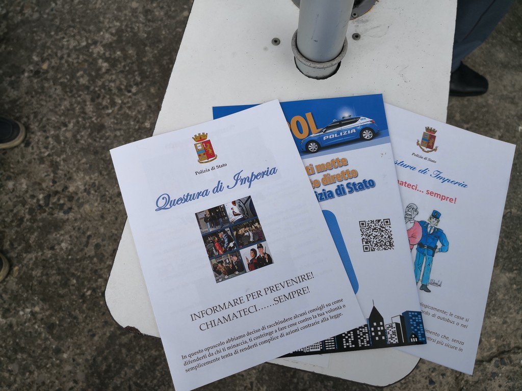 "Stiamo portando avanti da una decina di giorni iniziative di distribuzione delle brochure della Polizia di Stato in tutti i lidi. Partiamo da Diano Marina, poi arriveremo a Imperia Oneglia e Porto Maurizio e tutta la costa. Sono tre brochure che abbiamo fatto stampare in collaborazione con Grafiche Amadeo che ha capito l’importanza di questo nostro obiettivo e ci ha aiutato stampando 80mila brochure che stiamo distribuendo sui lidi e in città nei vari punti dove sono più fruibili. C’è la brochure di YouPol che è l’applicazione della Polizia di Stato dalla quale si può inviare direttamente una segnalazione dal telefonino o il tablet alla centrale operativa della Questura. Noi riusciamo a geolocalizzare l’evento, il soggetto può anche mandarci la foto o un video così ci rende il lavoro più semplice e riusciamo a mandare una volante immediatamente. Poi c’è la brochure ‘Chiamateci Sempre’ che contiene una serie di consigli utili, soprattutto per gli anziani che, durante queste ferie sono lasciati soli oppure sono più soggetti a truffe o raggiri da malintenzionati. Ci sono molti consigli utili per prevenire le truffe e i numeri da contattare in caso di emergenza, e non a caso si chiama ‘Chiamateci Sempre’.