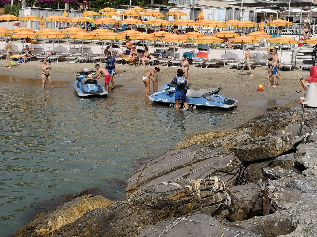 Moto d’acqua della Polizia protagoniste questa mattina ai Bagni Oneglio alla marina di Porto Maurizio. Giro perlustrativo e poi tante foto con i bagnanti.
