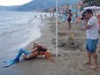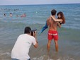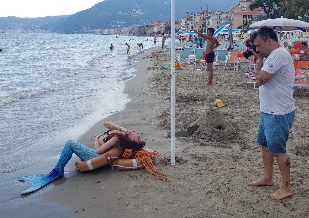 Una Sirena incanta i turisti alassini. Dopo l’inaugurazione della sua mostra personale di sabato scorso, alla galleria ‘Artender’ di Alessandro Scarpati e che ha visto una grande partecipazione di appassionati, il fotografo imperiese Riccardo Bandiera ha svolto ieri pomeriggio uno shooting fotografico in riva al mare davanti ai Bagni Lena, a pochi metri dalla mostra fotografica in passeggiata Cadorna 53 ad Alassio.