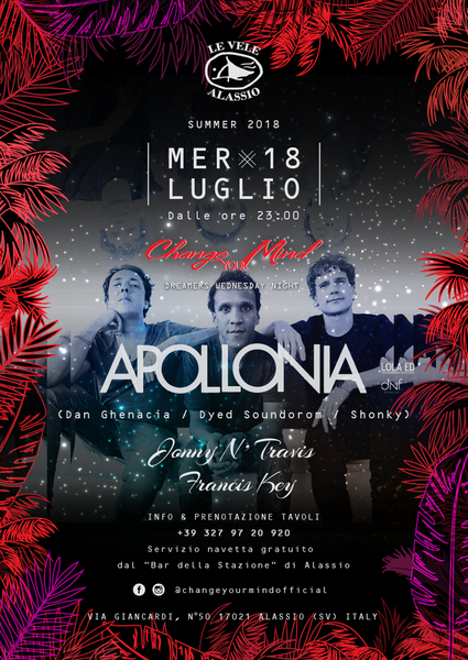 Le Vele Alassio presenta Change Your Mind, serata dedicata alla musica elettronica con ospiti di fama internazionale. Questo mercoledì special guest djs: Apollonia. Resident djs: Jonny N' Travis e Francis Key. L'ingresso è in riduzione entro le ore 00:30 e ridotto tutta la notte per i possessori della Resident Card. Vi aspettiamo!