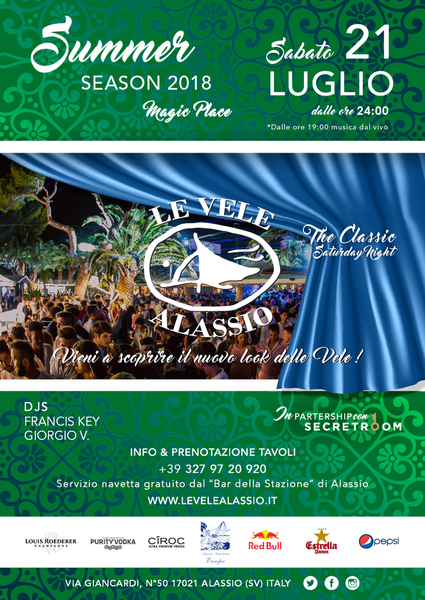 Sab 21 Luglio: Le Vele Alassio - The Classic Saturday NightLe Vele Alassio - The Classic Saturday Night, ed il titolo dice tutto: il leggendario sabato notte della Riviera ligure di Ponente firmato Le Vele Alassio! L'ingresso è in riduzione entro le ore 00:00 e ridotto tutta la notte per i possessori della Resident Card. Arrivate presto, fate festa insieme a noi e aspettiamo l'alba insieme!https://www.facebook.com