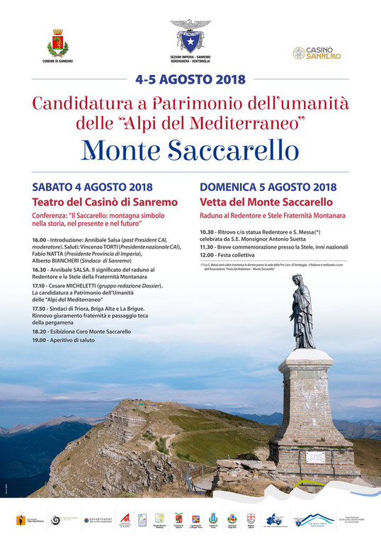 La manifestazione, che si realizzerà sabato e domenica, prevede nel pomeriggio del sabato una conferenza che si realizza in Sanremo presso il Teatro del Casinò, con una illustrazione dei due temi (1- il significato storico e sociale del raduno al Saccarello; 2- la candidatura Unesco delle "Alpi del Mediterraneo"), seguita dal passaggio di consegne della pergamena, una breve esibizione del coro alpino monte Saccarello e un rinfresco conclusivo. Il giorno successivo, domenica, si svolgerà il tradizionale raduno in vetta al Monte Saccarello.