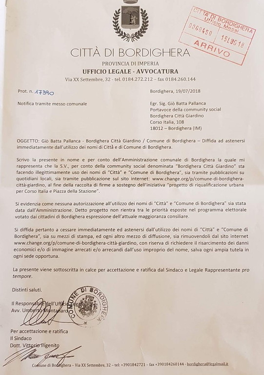 Nella missiva il primo cittadino bordigotto, Vittorio Ingenito, sottolinea che la community social starebbe illegittimamente facendo uso dei due nomi su Facebook e su un sito dove ha raccolto le firme a sostegno della riqualificazione urbana per corso Italia e piazza della Stazione.