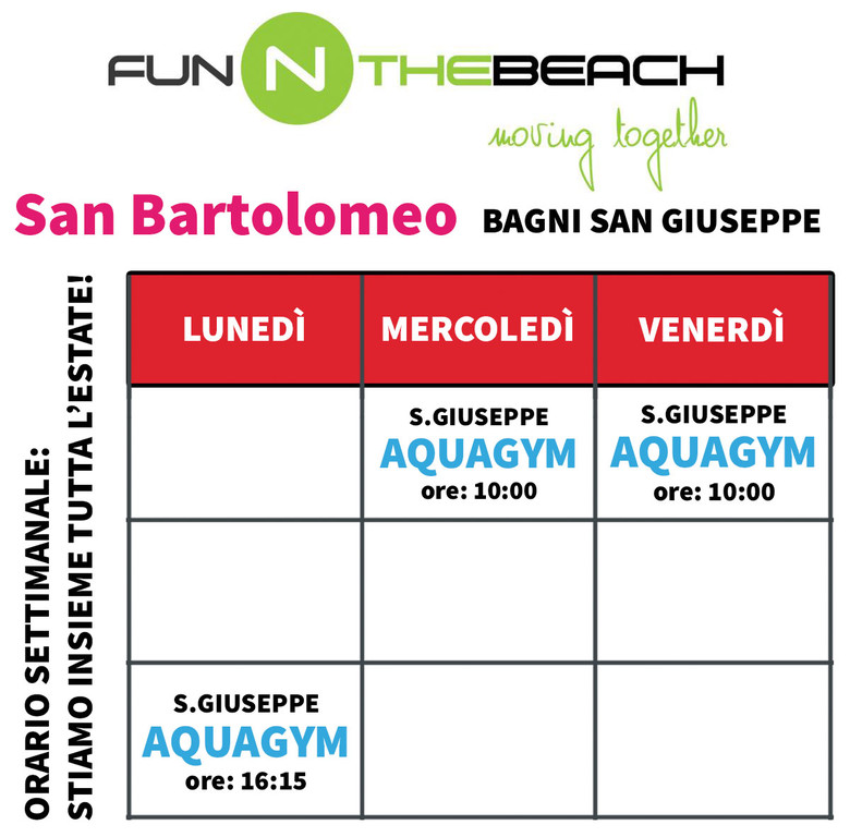 Le iniziative sono realizzate grazie anche al contributo di: Società Gestioni Municipali, Villa San Giuseppe e Bagni Paradiso (Diano Marina), Comune di San Bartolomeo al Mare, Consorzio QuiLagueglia. “Quest'estate il gruppo Fun on the Beach, capitanato da Roberto Nalbone, professionista da anni attivo nel settore di fitness e wellness, ha raccolto la sfida di proporre un ventaglio di attività in spiaggia, che coinvolga tutti. Dai più piccoli, fino ai membri anziani della famiglia, la squadra di Roberto non lascia nessuno ad annoiarsi sotto l’ombrellone” - spiegano i promotori del servizio.