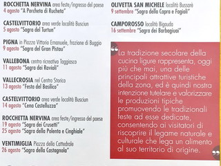 Si vuole consentire ai visitatori di riscoprire il legame naturale e culturale che lega un alimento al suo territorio di origine. Gli eventi riguardano Seborga, il 2 agosto con la sagra dei Batolli, Ospedaletti il 4 agosto con la sagra del Pignurin, Pigna e Rocchetta Nervina, sempre il 4 agosto con la Raviolata e la ‘Porcheta di Rucheta’, Castelvittorio il 5 agosto con la Sagra del Turtun’, Pigna il 9 agosto con la sagra del Gran Pistou, Vallebona l’11 agosto con la sagra dei Ravioli, Vallecrosia il 13 agosto con la festa del Basilico, Castelvittorio il 14 agosto con la Cen a Costelluzza, Rocchetta Nervina il 19 e 25 agosto con la sagra dei Crusetti e la sagra della Polenta e Cinghiale, Ventimiglia il 26 agosto con la sagra della Castagnola, Dolceacqua il 2 settembre con la festa dei Frescioi’, Bordighera il 7 e 8 settembre con la ‘BeerinBo’, Apricale il 9 settembre con la sagra della Pansarola e Zabaione, Olivetta San Michele la stessa sera con la sagra della Capra e Fagioli e Camporosso il 16 settembre con la sagra dei Barbagiuai.