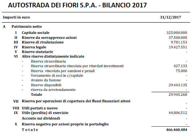 E’ necessario pertanto interrogarsi se il prezzo di 5,30 euro ad azione sia congruo rispetto alle disposizioni del Decreto Madia; esaminando il bilancio AdF al 31/12/2017 (segue stralcio Patrimonio Netto), a prima vista pare proprio che non lo sia. Il Patrimonio Netto della Società (la “consistenza patrimoniale” sopra citata) è pari ad euro 466.460.484 e la quota parte di pertinenza del Comune di Imperia per il suo 0,88% è pari ad euro 4.094.162 e quindi di per se’ superiore al prezzo di cessione proposto.