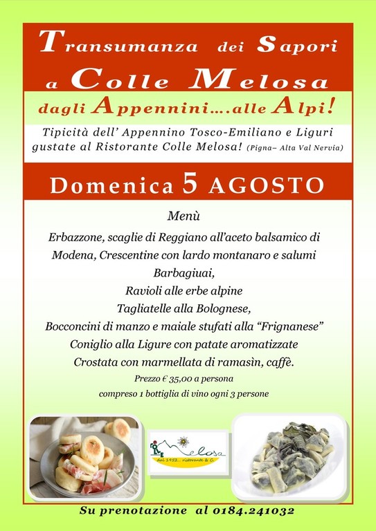 Situato nel cuore del Parco delle Alpi Liguri, in alta Val Nervia, a 1.545 metri s.l.m. il Ristorante Colle Melosa (già Locanda dal 1952) è solito proporre durante l'anno delle giornate a tema per farvi assaporare la cucina di montagna con delle escursioni eno-gastronomiche che sconfinano talvolta dal territorio di appartenenza, che ne ha sempre la priorità. Domenica 5 agosto verrà proposto una sorta di gemellaggio con la cucina dell'Appennino Tosco-Emiliano per farvi assaporare le tipicità di quel territorio. Si potranno apprezzare le famose Crescentine (o Tigelle), l'Erbazzone e le classiche tagliatelle alla Bolognese, ovviamente non mancheranno i Ravioli alle erbe Alpine, una delle migliori espressioni della cucina locale.(vedi il menù allegato)