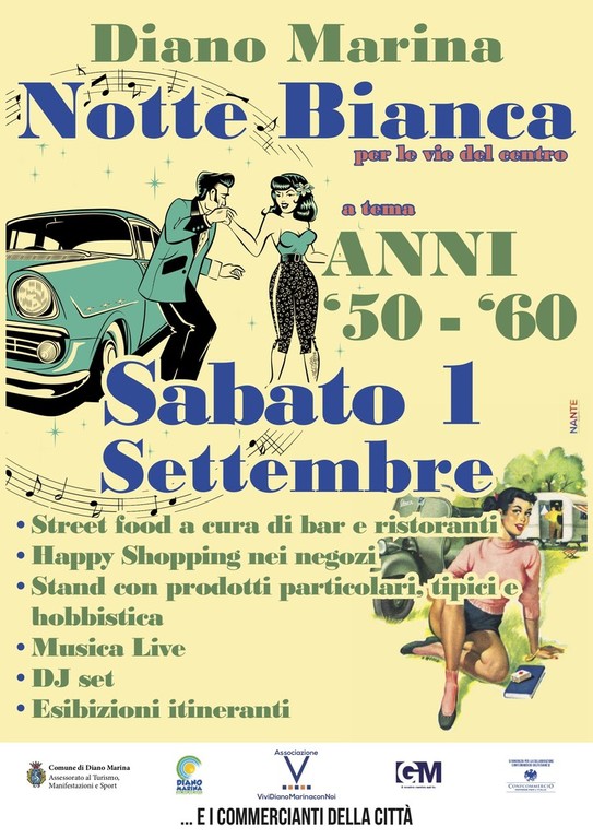 Almeno un appuntamento al giorno, nella settimana a cavallo tra fine agosto e fine settembre, a Diano Marina, per allietare gli ancora numerosi turisti e il tempo libero dei residenti. Il clou nel week end con l’ormai consueta notte bianca di inizio settembre, questa volta a tema Anni ‘50 e ‘60, e le numerose iniziative collaterali. Ma nei feriali non mancano i motivi d’interesse.