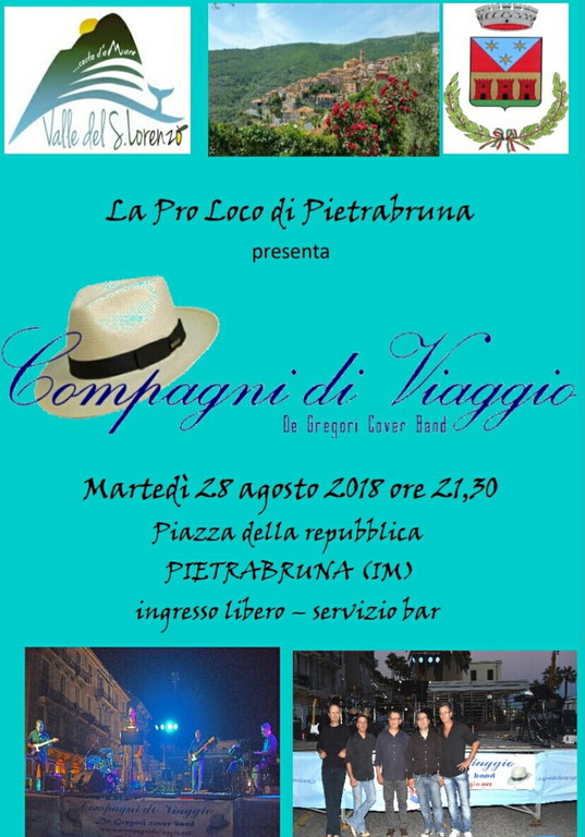 Domani, martedì 28 agosto, alle ore 21.30, in piazza della Repubblica a Pietrabruna, si terrà un concerto ad ingresso libero della band ‘I Compagni di Viaggio'. Il gruppo propone brani dal vasto repertorio di De Gregori. Il bar sarà aperto.