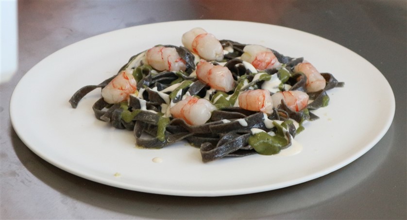 Linguine di riso venere, latte di pinoli e gamberi rossi di Sanremo