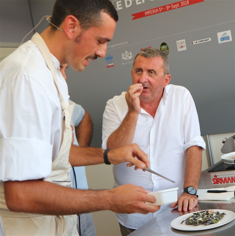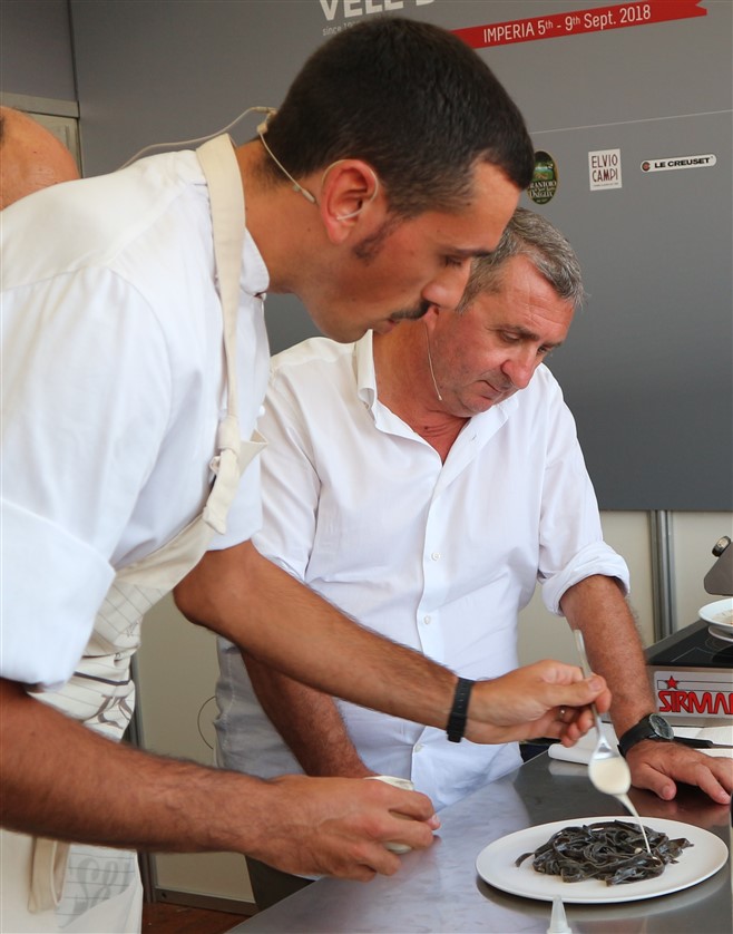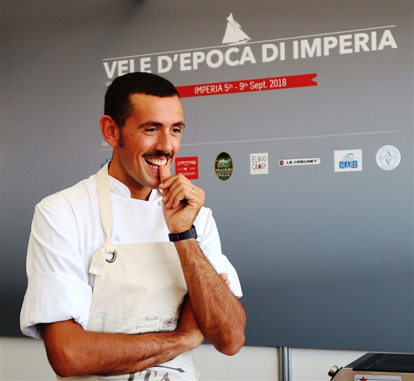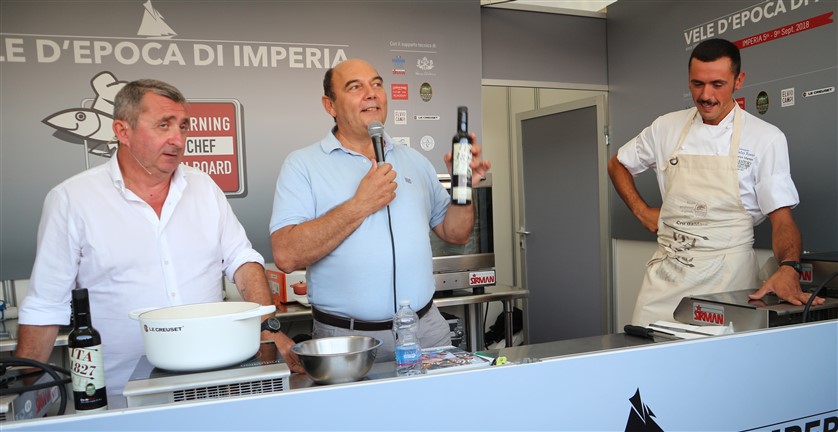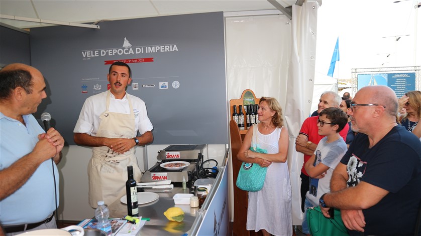 Durante l’applauditissimo incontro con Vito, introdotto dal nostro giornalista gastronomo Claudio Porchia, Enrico Marmo lo chef del ristorante dei Balzi Rossi di Ventimiglia, utilizzando i prodotti del Frantoio Santa'Agata di Oneglia sponsor delle Vele d’Epoca 2018, ha realizzato due piatti originali: