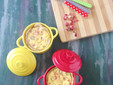 Trascorso il tempo di riposo della base, stendete la brisè e rivestite due cocotte monoporzione, sia il fondo sia le pareti; bucherellate il fondo con i rebbi di una forchetta e dividete la farcia nelle cocotte. Per ultimo aggiungete le rondelle di cipolla egiziana.