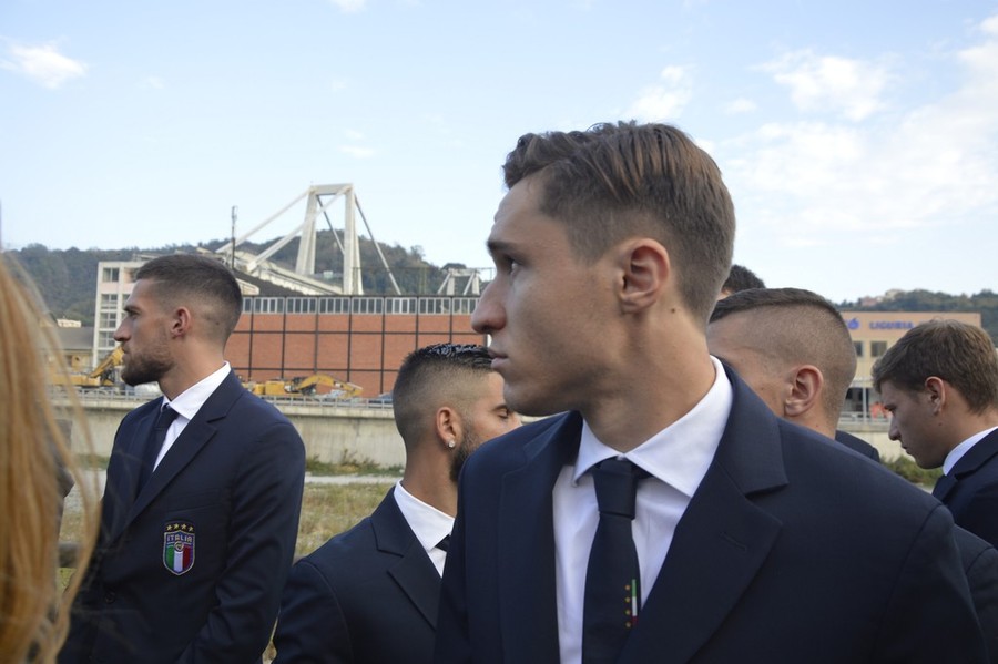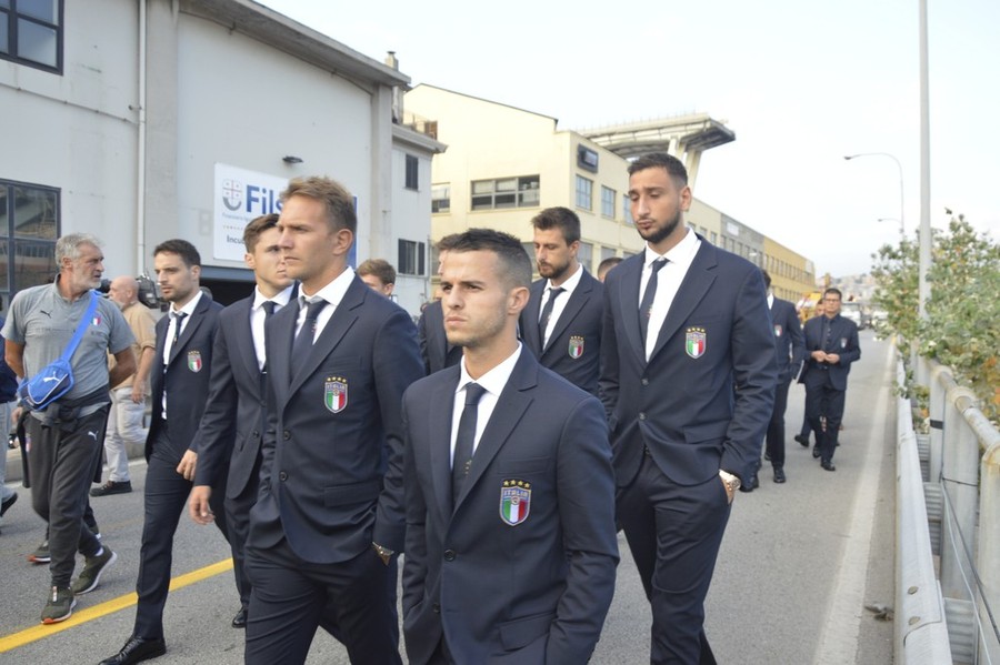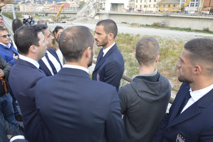 I calciatori della Nazionale guidati dal ct Roberto Mancini hanno deposto una corona di fiori nei pressi del Ponte Morandi di Genova, tragicamente crollato nella sciagura dello scorso 14 agosto. Il pullman si è fermato a trecento metri dai monconi del viadotto, conosciuto dai genovesi come il "ponte di Brooklyn", dove hanno perso la vita 43 persone. In testa alla delegazione Mattia Perin, ex portiere del Genoa, e Gianluca Caprari, attaccante della Sampdoria. E al loro fianco Leonardo Bonucci e Giorgio Chiellini.