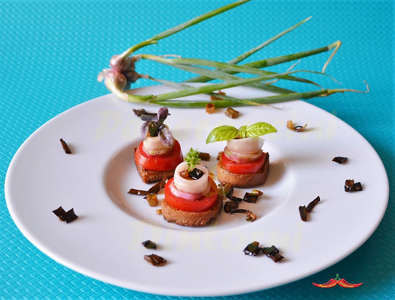 Ora avete tutto quello che vi serve per comporre il Fingerfood, in un piatto mettete i pezzetti di pane, sopra deponete una fettina di pomodoro, continuate con le fettine di cipolla egiziana.