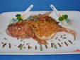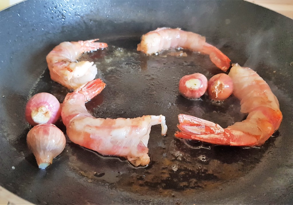 Gamberoni al guanciale alla Grappa, Tarassaco saltato e Cipolle Egiziane