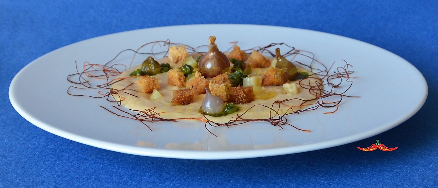 Mettete la crema in un piatto da portata, battete sotto per farlo diventare piatto, mettete 4 punti di salicornia, una al centro e 3 a 120 gradi, sopra deponete le Cipolle, aggiungete i cubetti di patate e quelli di pane, guarnite con il dei fili di peperoncino.