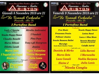 A partire da giovedì 8 novembre tris di spettacoli al Teatro Ariston. Giovedì 8 e venerdì 9 alle ore 21.00 torna l’appuntamento annuale con “Le grandi orchestre” spettacolo da un’idea di Silvio Tromba e Mario Poier, che porta sul palco dell’Ariston oltre 20 orchestre da ballo da quasi tutta Italia. "Presenta la serata Alex SO di Radio Sorriso. Orchestra base Portofino Band. Prezzi di ingresso: platea € 35,00 - € 30,00 galleria € 30,00 - € 25,00" - sottolineano dal teatro matuziano.