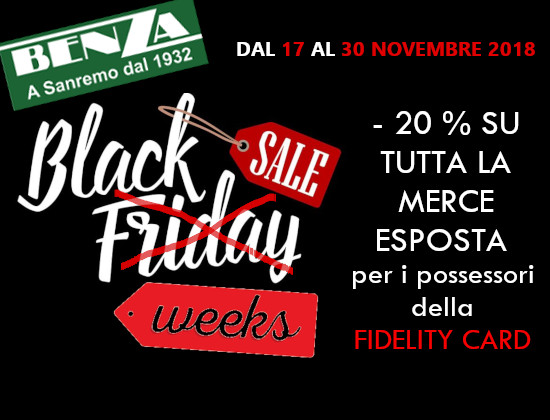 In occasione del lungo periodo dedicato agli sconti, gli specialisti dell'outdoor living del gruppo Benza proporranno le 'Black Weeks': da sabato 17 a venerdì 30 novembre, la storica ditta di Sanremo metterà la merce in esposizione, disposta in un ampio showroom di due piani, in supersconto. Articoli da giardinaggio, piscine, arredamenti per esterno e interno del meglio del Made in Italy saranno così messi a disposizione dei possessori della Fidelity Card ad un prezzo vantaggioso. Per un'anteprima dei prodotti è possibile consultare il sito www.benzashop.it.