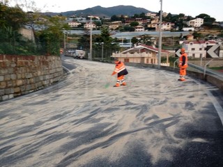 Sono intervenute tre squadre ed è stato ripulito l’asfalto (sia a mano che con una macchina apposita) e poi trattato con della segatura.