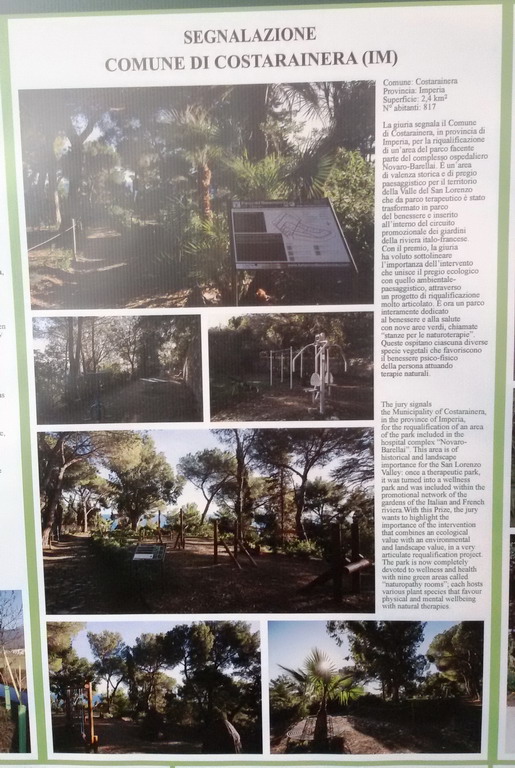 A ritirare l’onorificenza è stato il dott. Stefano G. Pirero, tecnico responsabile del progetto transfrontaliero europeo “Jardival” - Valorizzazione dei Giardini della Riviera Franco Italiana (Programma Interreg Italia-francia ALCOTRA 2014-2020) –, che ha spiegato come la rinascita di un sito naturale problematico e caduto in abbandono da decenni, come la vasta area verde che abbraccia l’ex ospedale sanatoriale “Giacomo Filippo Novaro”, dipenda anche e soprattutto dalla declinazione moderna, ovvero dalla ri-attualizzazione che si fornisce alla sua valenza storica e culturale. “È stato un onore e un onere – ha dichiarato Stefano Pirero – poter rappresentare il sindaco e gli impiegati dell’amministrazione comunale di Costarainera oltre che, naturalmente, tutti i tecnici responsabili che hanno preso parte a questo ambizioso progetto europeo in un’ottica di collaborazione e competizione transfrontaliera. Grazie al lavoro e alle competenze di tutti, siamo riusciti a recuperare e a riqualificare una piccola porzione (5.500 mq circa) di un grande polmone verde che, sin dai primi anni Trenta del secolo scorso, era stato progettato per favorire la cura delle principali patologie tubercolari e che, oggi, risorge a nuova vita come un parco dedicato alle naturoterapie, al relax, al fitness e allo svago all’aria aperta”.