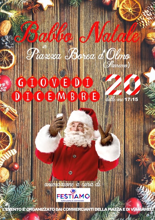 L'evento, organizzato dai commercianti di via Mameli e di Piazza Borea d'Olmo, si terrà nell'omonima piazza e vedrà l'animazione curata dallo staff di Festiamo. L'arrivo di Babbo Natale e del suo aiutante elfo è previsto alle ore 17.15: per l'occasione, i bambini potranno farsi immortalare da un apposito fotografo professionale assieme al 'babbo' più atteso dell'anno. Le foto verranno date immediatamente al bambino con una simbolica libera offerta.